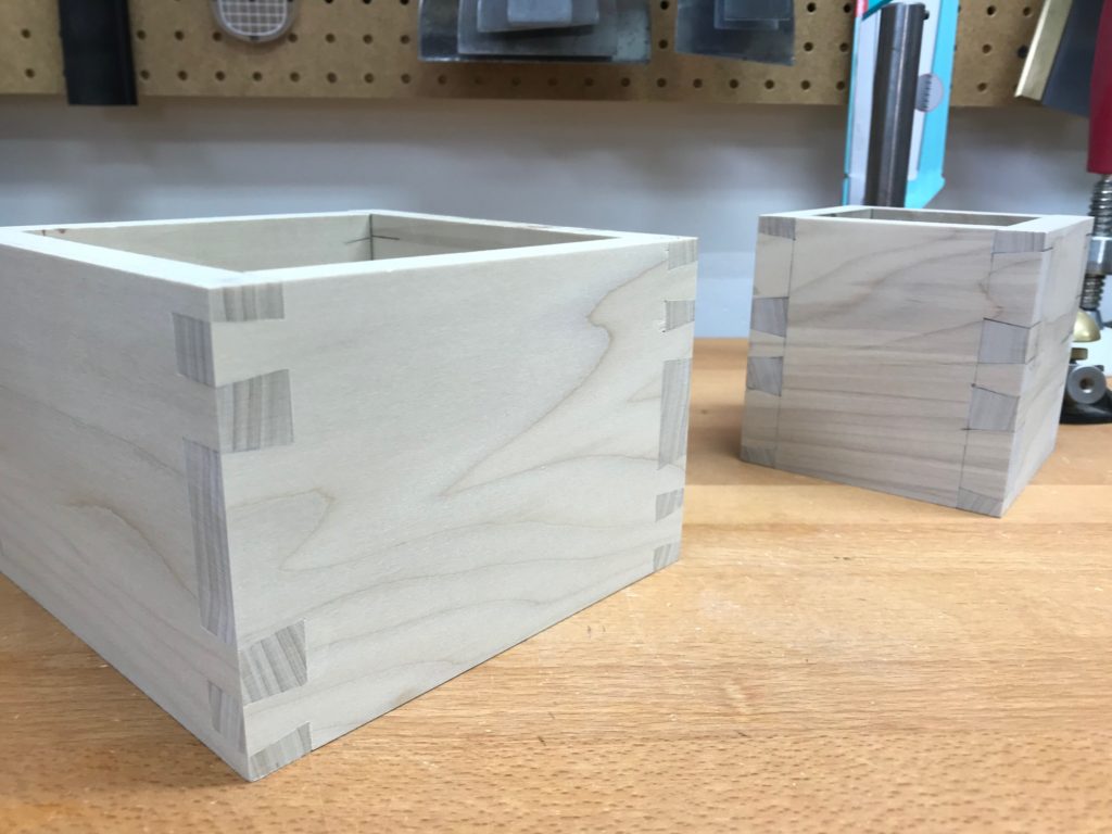 I have worked for the past 2 weeks, on and off, trying to cut these. And the results were similar to previous attempts. I started to wonder if the world really is separated into those who can and those who can’t cut dovetails. Interestingly, these failures were also killing my motivation for woodworking in general. I have watched hours of YouTube videos and read many books and magazine articles. Everyone has their own opinions and techniques and recommendations – it seems like woodworkers are more dogmatic in general than others…. Through all of this I discovered hand-cut dovetail jigs. These are handheld devices that are manufactured with the correct pins and tails angles and contain little built-in magnets to hold a saw to the cut line. So I invested the money and tried them. The lesson learned is one that I keep re-learning throughout my life: there really are no shortcuts and if you want to do something, just keep practicing until you get it right. These jigs are ingenious devices and I can see how they can accelerate the learning curve, but they were just not for me. I found myself becoming lazy and my saw cuts were really no better than without the jig, just sawing to a line.
